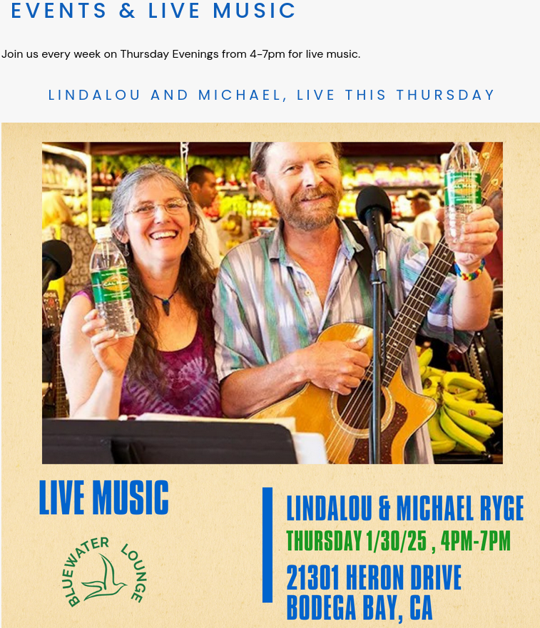 We’re delighted to have been asked to play again at the Bluewater Lounge in beautiful Bodega Bay on Thursday, January 29th, 2026 from 4pm to 7pm.